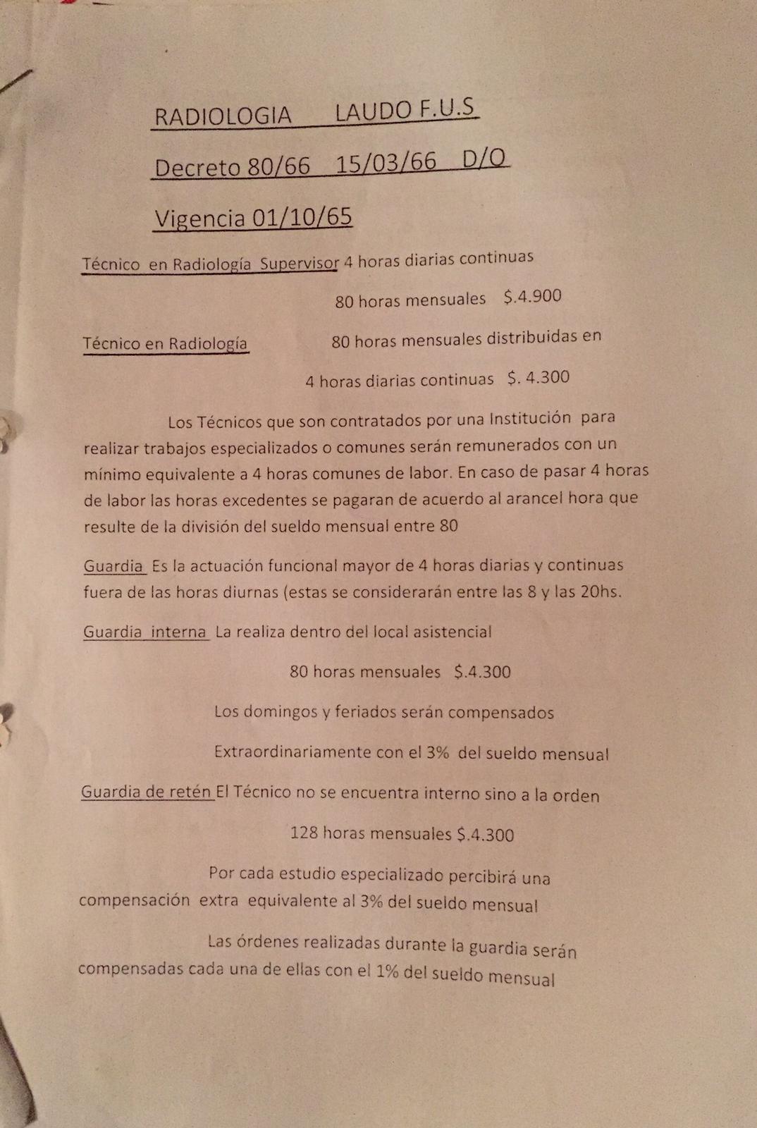 El Decreto N° 258/987 de 26 de mayo de 1987 publicado el 15 de julio 1987, estableció la definición de categorías y horarios del personal no médico del grupo salarial «SALUD y ANEXOS» - del Consejo de Salarios. Se determinó también, para el caso del Auxiliar de Radiología, una carga horaria de «6 horas diarias de lunes a viernes - 120 horas mensuales» y para el caso de los Técnicos en Radiología, actuales Licenciados, se establece una carga de «4 horas diarias de lunes a viernes - 80 horas mensuales”.